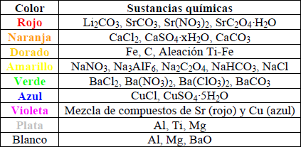Sin embargo, en el caso de los fuegos artificiales, un tercer elemento resulta clave: el responsable del color. Suele tratarse de sales o incluso sustancias metálicas, que resumimos en la siguiente tabla.