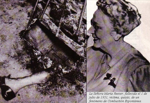 La razón de la rareza de los testimonios oculares puede, en su opinión, deberse precisamente a que la combustión espontánea le ocurre a la gente cuando están solas. El caso de Mary ReeserMary Reeser era una viuda de 67 años que vivía en un pequeño apartamento en Florida. El dos de julio de 1951 llegó un telegrama para ella. La casera, que vivía en la misma finca, trató de entregarlo pero la viuda Reeser no respondió a sus llamadas. La casera trató de abrir la puerta pero el pomo estaba tan caliente que no pudo contener un grito de dolor. La señora pidió ayuda a dos pintores que trabajaban en las proximidades. Éstos, de forma muy imprudente, forzaron la entrada a base de empujar la puerta hasta que cedió destrozada en varios pedazos. Tuvieron que echarse atrás inmediatamente pues una ráfaga de aire ardiente y humo salió del interior.