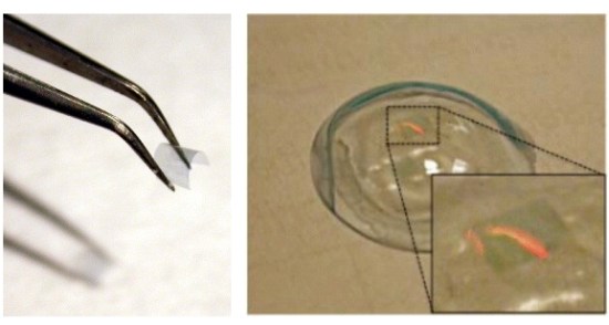 La imagen de la izquierda muestra la flexibilidad del metamaterial, mientras que a la derecha es posible observar su adaptación sobre una lente de contacto