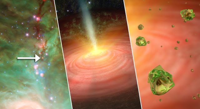 “los cristales se formaron cerca de la superficie de la estrella en formación” y luego fueron transportados hasta el interior de la nube, donde las temperaturas son más frías, a través de chorros de gas disparados desde la estrella emergente.