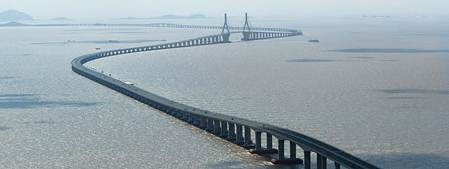 Es el más largo del mundo sobre el mar con 35,6 kilómetros, fue estrenado en Mayo del 2008 en la costa este de China. Elevado con más de seiscientos pilares de cerca de noventa metros de altura sobre las aguas, este desmesurado puente impulsará más aún el desarrollo económico de la provincia de Zhejiang, donde se encuentra, y del delta del río Yangtsé, al aproximar por carretera los enclaves comerciales de Shanghái y Ningbo.