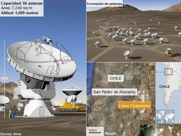 El mayor proyecto astronómico terrestre desarrollado hasta el momento se inauguró el día 13 de este mismo mes en el desierto chileno de Atacama. El telescopio Atacama Larges Millimeter/submillimeter Array (ALMA) es un proyecto de colaboración entre la Organización Europea para la Investigación Astronómica en el Hemisferio Sur (ESO), de la que España forma parte, y sus socios internacionales de América del Norte y Asia Pacífico en cooperación con Chile.
