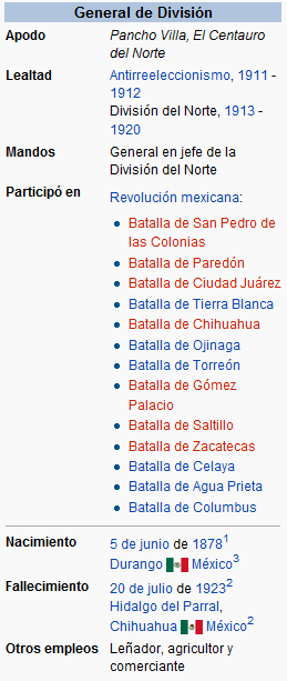 José Doroteo Arango Arámbula, mejor conocido por su seudónimo Francisco Villa o el hipocorístico de éste, Pancho Villa. Fue uno de los jefes de la revolución mexicana, cuya actuación militar fue decisiva para la derrota del régimen del entonces presidente Victoriano Huerta. Originario del estado de Durango (se desconoce si era de Río Grande o de San Juan del Río, nació el 5 de junio de 1878 y murió asesinado en una emboscada en Hidalgo del Parral (Chihuahua) el 20 de julio de 1923. Durante la revolución fue conocido como "El Centauro del Norte".