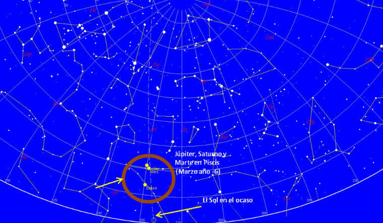 Estos tres planetas estuvieron suficientemente cerca como para ser un grupo llamativo en el año 6 antes de C, en la constelación de Piscis. Sin embargo los tres ocupaban un área de unos 8° que en el cielo es bastante extensa, y por ello no se los veía como un único objeto que pudiera considerarse "estrella", tal como puede verse en la Figura 3.