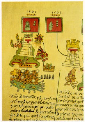 1 (Anales mexicanos. Formada por l8 láminas, se le llama así porque contiene las fechas o años en los que sucedieron los eventos que se pintan. Se inicia con la lámina de la fundación de Tenochtitlán, en la parte central aparece el águila sobre un nopal, y a sus lados dividida por una X formada por canales azul turquesa, una serie de señores, cada uno con su nombre pintado a la usanza indígena.Toda esta escena está enmarcada por una serie de cuadros azul turquesa con los símbolos de los años ácatl (caña), tochtii (conejo), calii (casa) y técpatl (pedernal), los cuales están dando la fecha del acontecimiento central. En la parte inferior se observa una escena de guerra contra Culhuacán y Tenayuca.