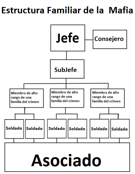 La Cosa nostra es como se denomina la organización de la mafia en los Estados Unidos, en donde cada barrio, ciudad o hasta estado es dirgido por una "Familia" en la cual se subdividen rango de un simple torpedo o soldado (soldati) pasando por capos y consiglieri hasta llegar al más alto rango de una familia El Padrino, que tiene que ser ratificado por la comisión de la Cosa nostra. Para hacerlo más simple se dividiría en Soldado, Capo, Subjefe y el Don o Padrino.