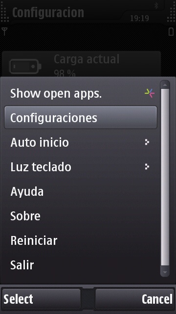 * Icono de estado que muestra el tiempo, la memoria libre, uso de la CPU, el nivel de la batería, y el uso de la unidad.