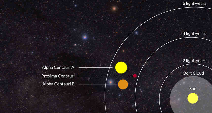 Sin embargo, gravitacionalmente hablando, pertenece a un sistema triple en el que Próxima gira alrededor de un sistema binario a una distancia diez mil veces mayor que la distancia entre el Sol y la Tierra. Los miembros de la binaria interior se denominan Alpha Centauri A y B, que se parecen bastante a nuestro Sol. Giran una alrededor de la otra a una distancia veinte veces mayor que la distancia Sol-Tierra.